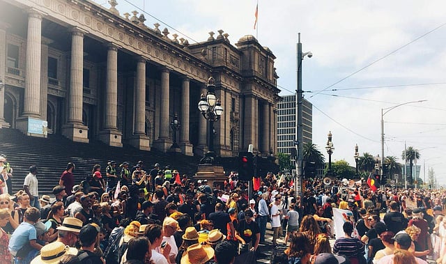 More than 10,000 people joined a march in Melbourne where protestors chanted "always was, always will be Aboriginal land", and holding banners stating "You are on stolen land".