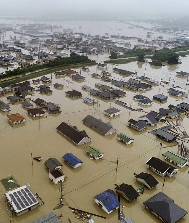 A residential area in Okayama prefecture, on the main island of Honshu, had brown water spreading like a huge lake through it.