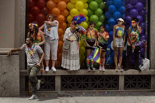 On foot, on roller skates, on motorbikes or riding on some 100 spectacularly colorful floats, participants moved slowly on a hot, sunny day along the two-mile (three-kilometer) parade route from historic Stonewall Inn in Greenwich Village, over to Fifth Avenue, then up to 29th Street.