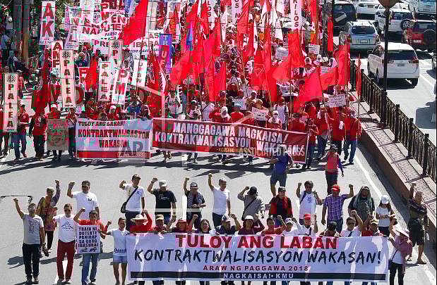 About 5,000 people from various groups rallied near the presidential palace in Manila to protest the failure of Philippine President Rodrigo Duterte to fulfill a major campaign promise to end contractualization, the widespread practice of short-term employment.