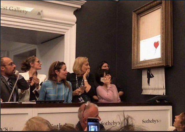 In a twist to be expected from street art's most subversive character, the canvas suddenly passed through a shredder installed in the frame.