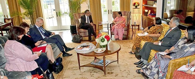 As Trump left the podium at the conclusion of the event, US Ambassador to the UN Nikki Haley warmly hugged Swaraj and introduced her to the president.
