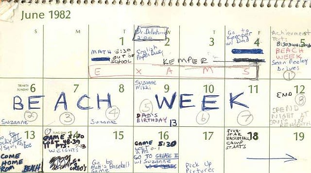 The May through August calendar pages mention several parties at various houses and also a beach week, highlighted in all caps the week after his exams end. Ford says she doesn't remember where or exactly when the assault took place.