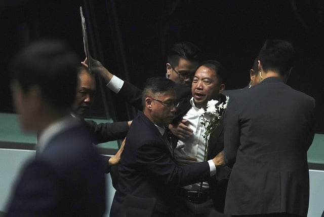 HONG KONG: Pro-democracy lawmakers were dragged out of Hong Kong's legislature by security guards on Thursday after they heckled the city's pro-Beijing leader for a second day running, the latest outburst of political rancour in the strife-torn city.