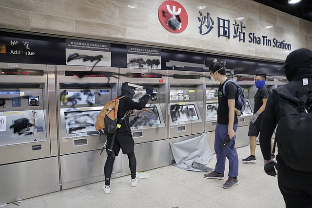 The protesters used hammers to knock the ticket sensors off gates and spray-painted and broke the screens of ticket machines, using umbrellas to shield their identities.