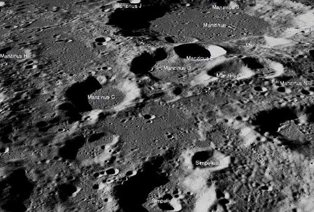 The Vikram lander module attempted a soft landing on a small patch of lunar highland smooth plains between Simpelius N and Manzinus C craters before losing communication with ISRO.