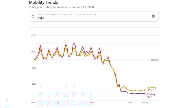 It shows the dramatic drop in the number of users driving, walking or taking public transit as governments around the world rolled out increasingly stringent containment measures to stop the spread of the deadly virus.