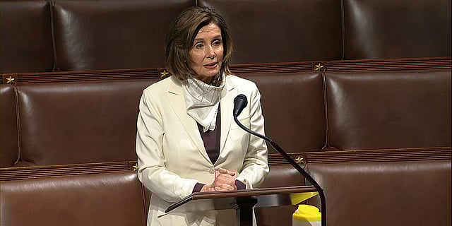 Signs of the pandemic were everywhere in the House chamber on Thursday. As Pelosi spoke from the floor, she lowered a white scarf that had covered much of her face. House Chaplain Patrick Conroy delivered the opening prayer wearing a yellow protective mask, and most lawmakers and aides on the chamber's sparsely populated floor wore masks as well.