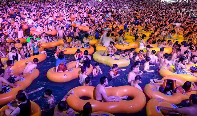 The popular Wuhan Maya Beach Water Park was filled with people frolicking in swimsuits and goggles for an electronic music festival, many perched on rubber dinghies or wading up to their chest in water.