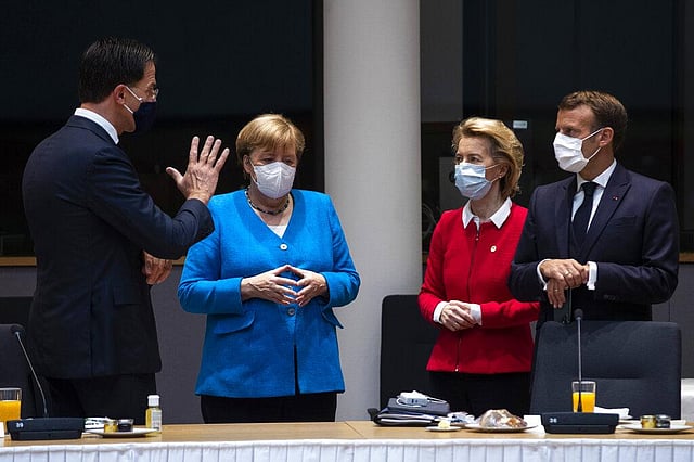 Heading into a balmy summer night, those tensions were showing when German Chancellor Angela Merkel and French President Emmanuel Macron got up and walked out of a meeting with the so-called Frugal Four group of wealthy northern nations that want to limit grants and impose strict conditions on mostly southern nations that have suffered most from the pandemic.