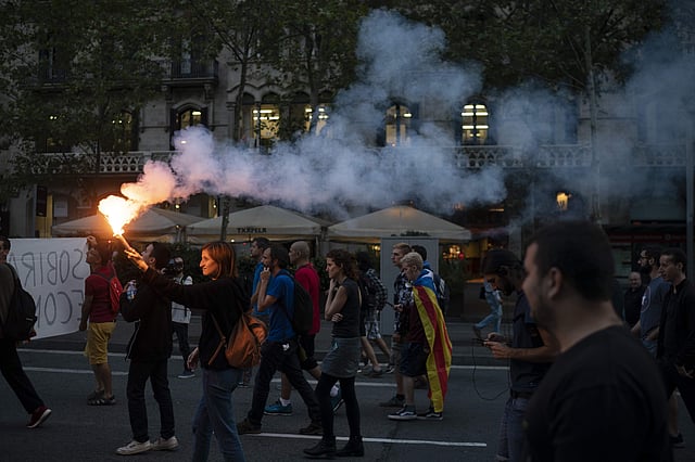 High-speed and regular trains in and out of the northern Catalan city of Girona were also delayed or cancelled due to “acts of vandalism,” according to a tweet by Spain’s railway infrastructure operator, ADIF. A photo circulated on messaging apps showed tires burning on railways next to a sign showing a crossed out upside down image of a crown.