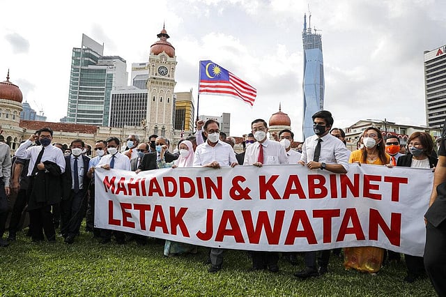 Dozens of lawmakers gathered near Parliament held a banner calling for the resignation of Muhyiddin and his Cabinet.