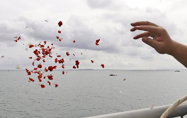 Many people wept as they prayed and cast flower petals into the water, and officials from the navy, the search and rescue agency, and Sriwijaya Air employees threw wreaths into the sea.