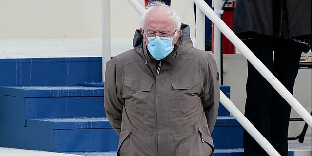 The image of a cross-legged Sanders wearing a light blue mask and seated alone at the inauguration was captured by AFP photographer Brendan Smialowski.