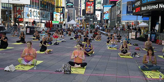 NEW YORK: The seventh International Yoga Day was celebrated at the iconic Times Square in New York on Sunday. The day-long yoga festival with the theme of 'Solstice in Times Square 2021' was attended by more than 3,000 people where yogis, with their yoga mats and flexible bodies, filled Times Square to mark the start of summer.