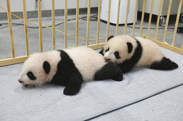 The twin cubs, which were palm-size pink creatures when born on June 23, have grown and now have their unique black-and-white blocks, with black fur around their eyes, ears and limbs.