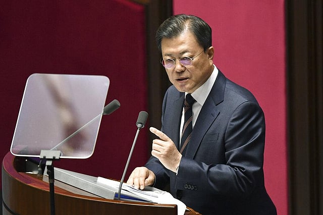 Moon praised himself for paving the way for a peace process on the Korean Peninsula by holding three summits with North Korean leader Kim Jong Un and helping arrange the first-ever North Korea-US summit between Kim and then-President Donald Trump in 2018.