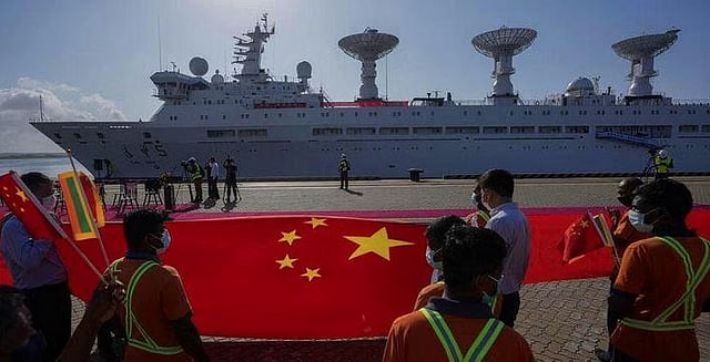 Sri Lankan port workers hold a Chinese national flag to welcome Chinese research ship Yuan Wang 5 as it arrives in Hambantota International Port in Hambantota, Sri Lanka(Photo | AP)