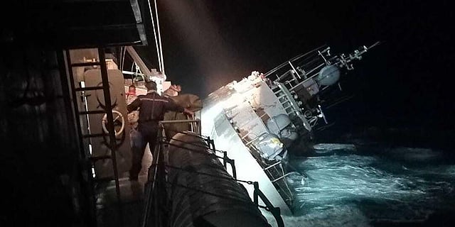 Another image shared by the navy showed the vessel as it was capsized, while a video showed a rescue boat alongside it in choppy waters.