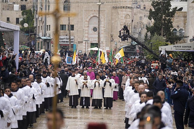 Scouts marched with bagpipes as thousands of onlookers lining the streets held balloons and cotton candy. The Latin Patriarch of Jerusalem, Pierbattista Pizzaballa, greeted worshippers upon his arrival to the town, ahead of leading the annual Christmas eve procession at the Church of the Nativity.