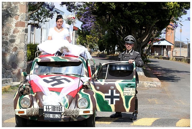 Among other things, the groom wore an SS uniform, and the wedding carriage, an old Volkswagen, featured a swastika on the hood and a black cross on the driver's door, according to reports.