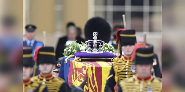 At 2.22 pm local time, the coffin placed on a horse-drawn gun carriage of the King's Troop Royal Horse Artillery began its ceremonial procession of under two kilometres to the Palace of Westminster.