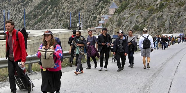 Russians have been crossing by car, bicycle, scooter and on foot. There also are long lines at the border with Kazakhstan, which has taken in more than 98,000 Russians in the past week. Russia has land borders with 14 countries.
