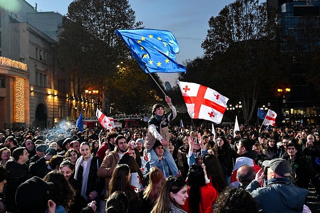 Waving Georgian and EU flags, cheering crowds flooded Tbilisi's central Freedom Square on Friday evening, an AFP journalist at the scene reported.