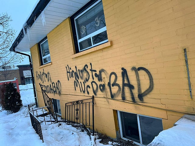 "Our temple was vandalised in the middle of the night with the possible intent of creating a rift amongst communities. It is not a good idea to use a religious place for such sloganeering," Pandit Dhirendra Tripathi, the head priest of Gauri Shankar Temple in Brampton, a suburb of Toronto, told TNIE.