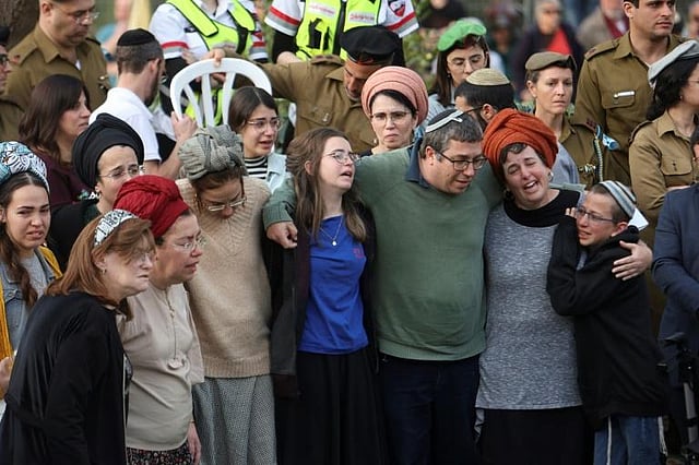 The coffins were draped in the Israeli flag and cries of mourners drowned out a rabbi reciting prayers, an AFP correspondent said.