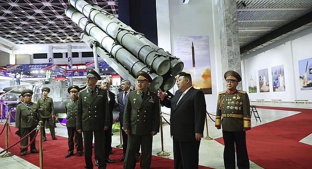 SEOUL: Walking past huge intercontinental ballistic missiles and previously unseen military drones, Kim Jong Un gave Russia's defence minister a tour of North Korea's newest and most advanced weaponry Thursday, state media reported.