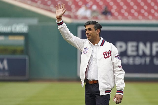 British Prime Minister Rishi Sunak waves to spectators as he attends a Washington Nationals baseball game during his visit to Washington, Wednesday, June 7, 2023. (Photo | AP)