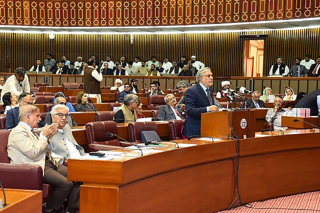 Pakistan National Assembly, shows Pakistan's Finance Minister Ishaq Dar presenting the budget 2023-2024 in the national assembly in Islamabad, June 9, 2023. (Photo | AFP)