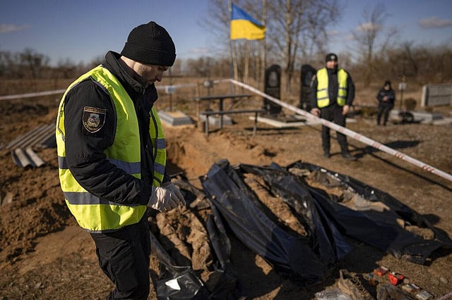 BORODYANKA: The freshly exhumed remains of three men lie in black body bags on the edge of the small cemetery in a town not far from Ukraine's capital, waiting to be taken to a morgue. None has yet been identified.