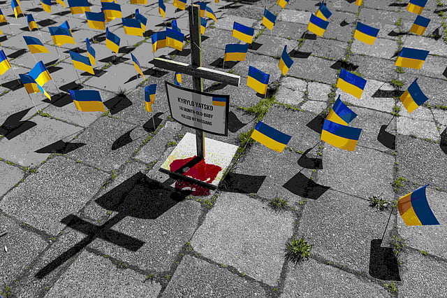 The installation included hundreds of fluttering blue and yellow Ukrainian flags and crosses serving as symbolic grave markers for Ukrainians killed by Russians during the full-scale war launched by Moscow last year.