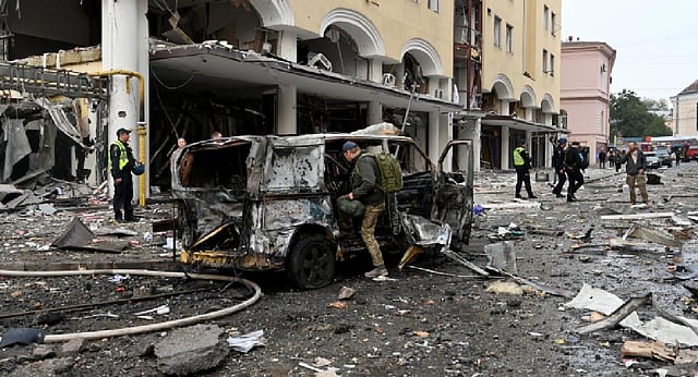 Rescue workers in Kharkiv were extinguishing fires next to charred vehicles, and missile fragments lay at the bottom of a deep crater in the centre of the city, an AFP journalist at the scene said.