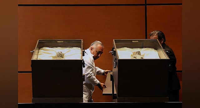 Mexican journalist José Jaime Maussan presented two boxes with supposed mummies found in Peru, which he and others consider "non-human beings that are not part of our terrestrial evolution."