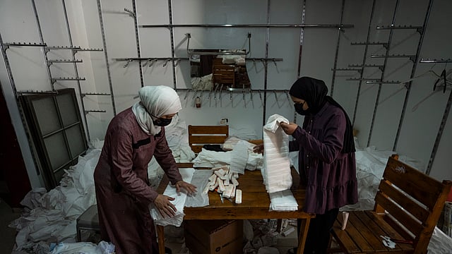 RAFAH: Their scissors move quickly, shearing pieces of white cloth to be stitched together with cotton pads and taken to market in battered cardboard boxes.