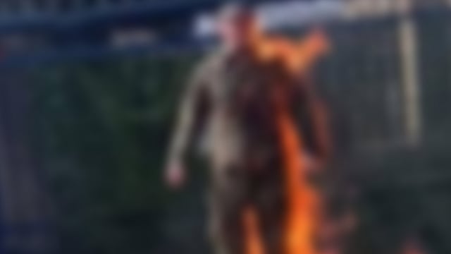 He then lights himself on fire while yelling "Free Palestine!" until he falls on the ground.