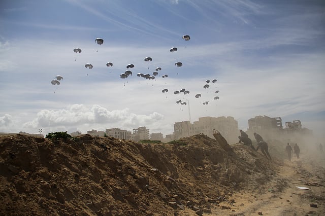 People dashed through devastated Gaza City neighborhoods as the parachuting aid descended. "I have orphans, I want to feed them!" one woman cried.