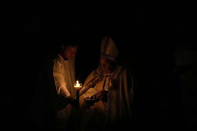Francis entered the darkened, silent St. Peter’s Basilica in his wheelchair, took his place in a chair and offered an opening prayer. Sounding somewhat congested and out of breath, he blessed an elaborately decorated Easter candle, the flame of which was then shared with other candles until the whole basilica twinkled.