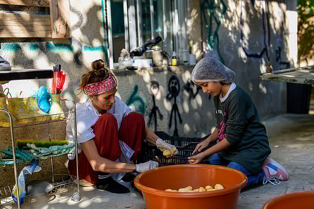 Back in Aqaibe, some displaced women from nearby areas have joined Sfeir and others volunteering at the kitchen: chopping vegetables, cooking rice in large vats, packaging meals in plastic containers, and sharing coffee together on the balcony.