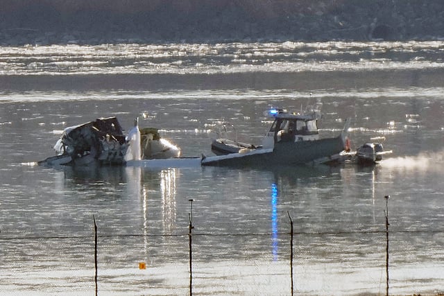 Wreckage of the Bombardier jet operated by an American Airlines subsidiary protruded from the surface, surrounded by emergency vessels and diving teams. It had been carrying 64 people.