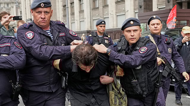 Nadezhdin’s aide, Dmitry Kisiev, who picketed the parliament building with a poster likening the legislation to the world of George Orwell’s dystopian “1984,” was quickly rounded up by police, who also detained several reporters covering the protest.