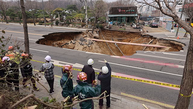 The roughly 20-meter-wide, the 20-meter-deep sinkhole appeared at an intersection in the Myeongil-dong neighborhood in eastern Seoul on Monday afternoon, swallowing the motorcyclist and injuring a woman whose van was passing over the site, according to safety and emergency offices.