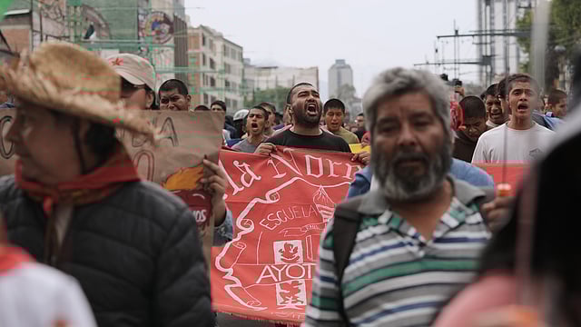 Protesters marched from the Tlatelolco plaza where in 1968 Mexican troops attacked students demanding an end to Mexico’s militarization and greater freedoms, leaving a never established death toll believed to be in the hundreds, to the capital’s central plaza.