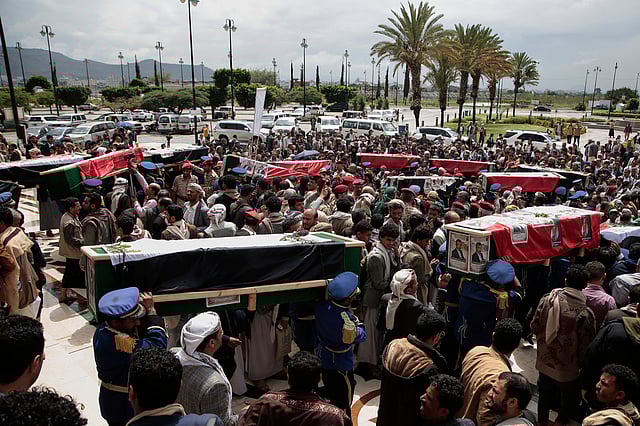 Houthi-run Al-Masirah TV broadcast the funerals Tuesday, showing dozens inside a mosque and the caskets being carried ahead of the burial. An honor guard stood beside the coffins.