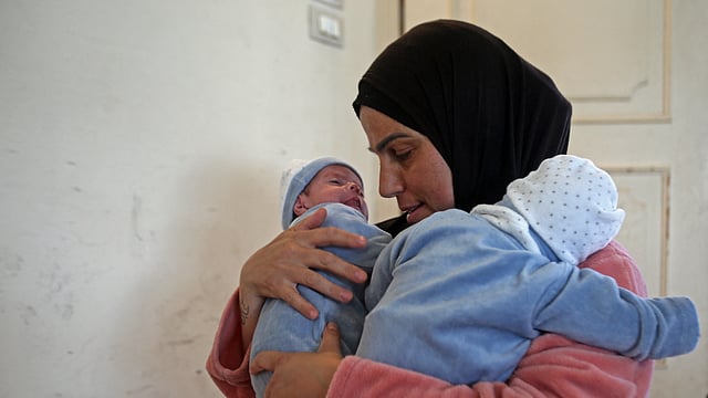 In a university classroom in south Lebanon's city of Sidon, Ghada Fadel, 36, cares for her tiny twin sons. Mohammed and Mehdi are just over a month old, dressed in blue jumpsuits and matching beanies.