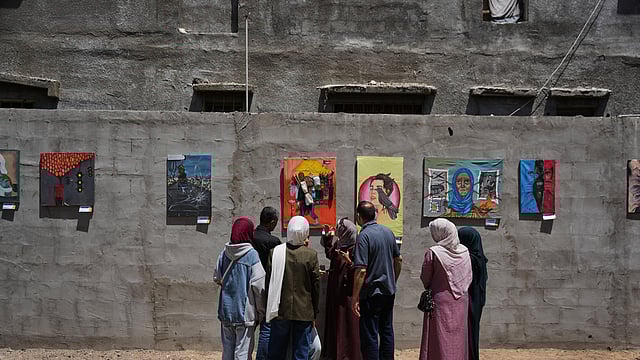 The row of paintings, like much of Gaza life itself, was displayed outdoors, open to the weather and curious stares. There was a painting of a dove, a bullet hole, a person's silhouette in a territory where the war between Israel and the militant Hamas group has killed well over 70,000 people.