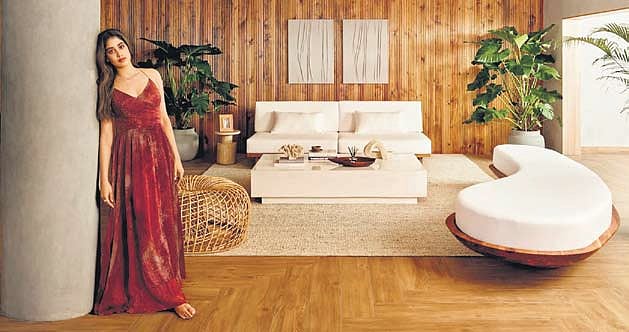 This luxurious coastal abode sports earthy elements from the hand-crafted marble lotus sculpture gracing the entrance of the home to the expansive interior spaces styled in bamboo, rattan and marble, the entire home is designed for ultimate relaxation. Within the heart of the home lies a minimalist living room, a dining area rich with cherished family photographs placed in every corner, Janhvi’s dressing room where she develops her natural skincare treatments and an airy master bedroom featuring a cosy canopy bed covered in white sheets.